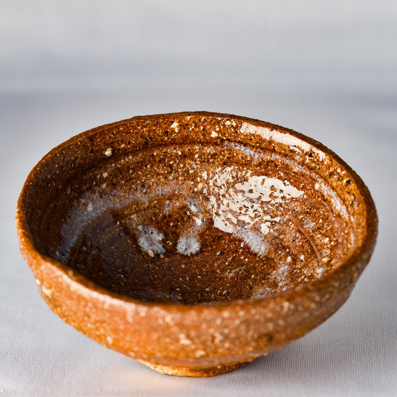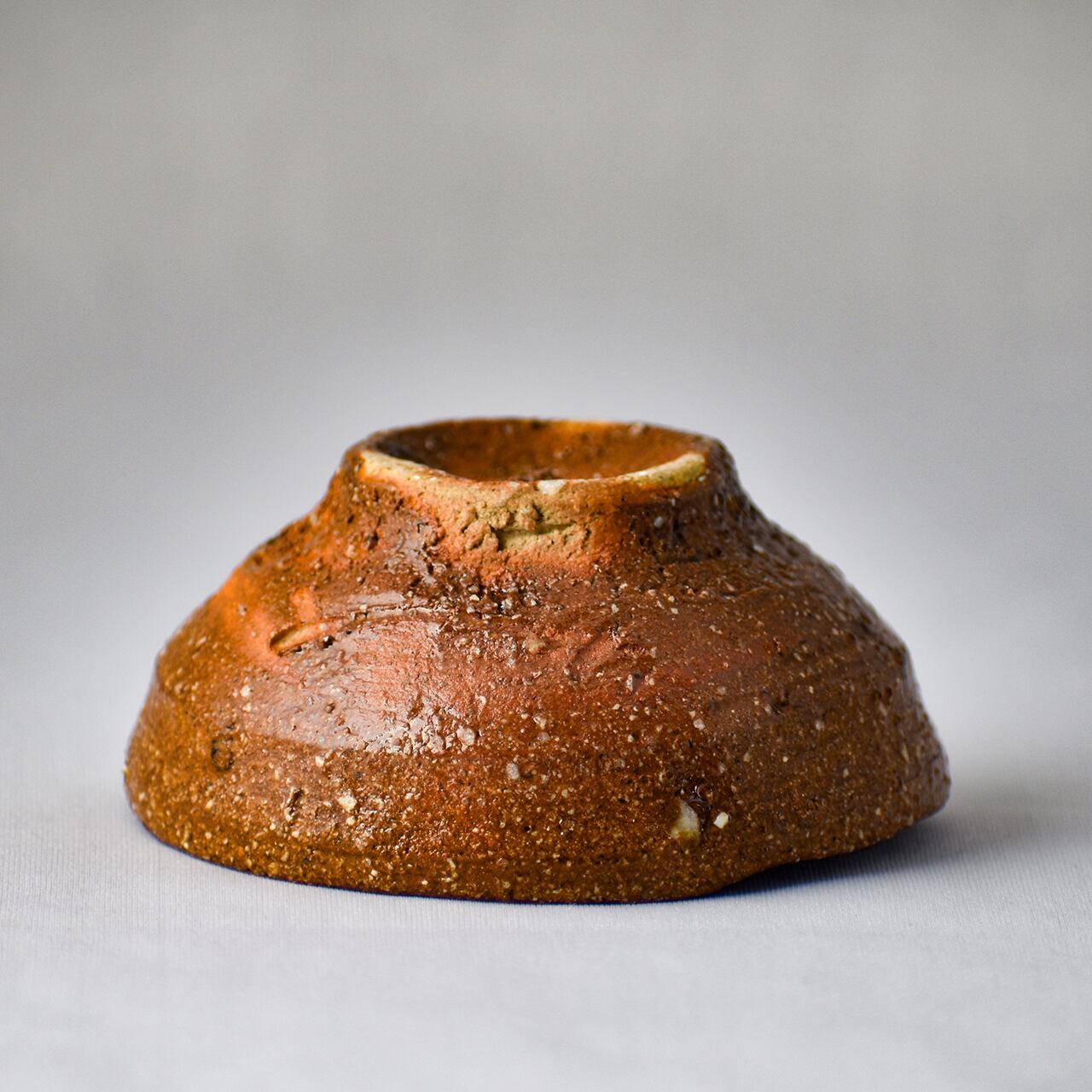 この土は可塑性が低いので丹波の土を混入し轆轤(ろくろ)成形。べべらな口造り、小石混りの茶褐色は野趣に富んだ景色。使い古して枯れると、さらに味が出てくるのではないでしょうか。
